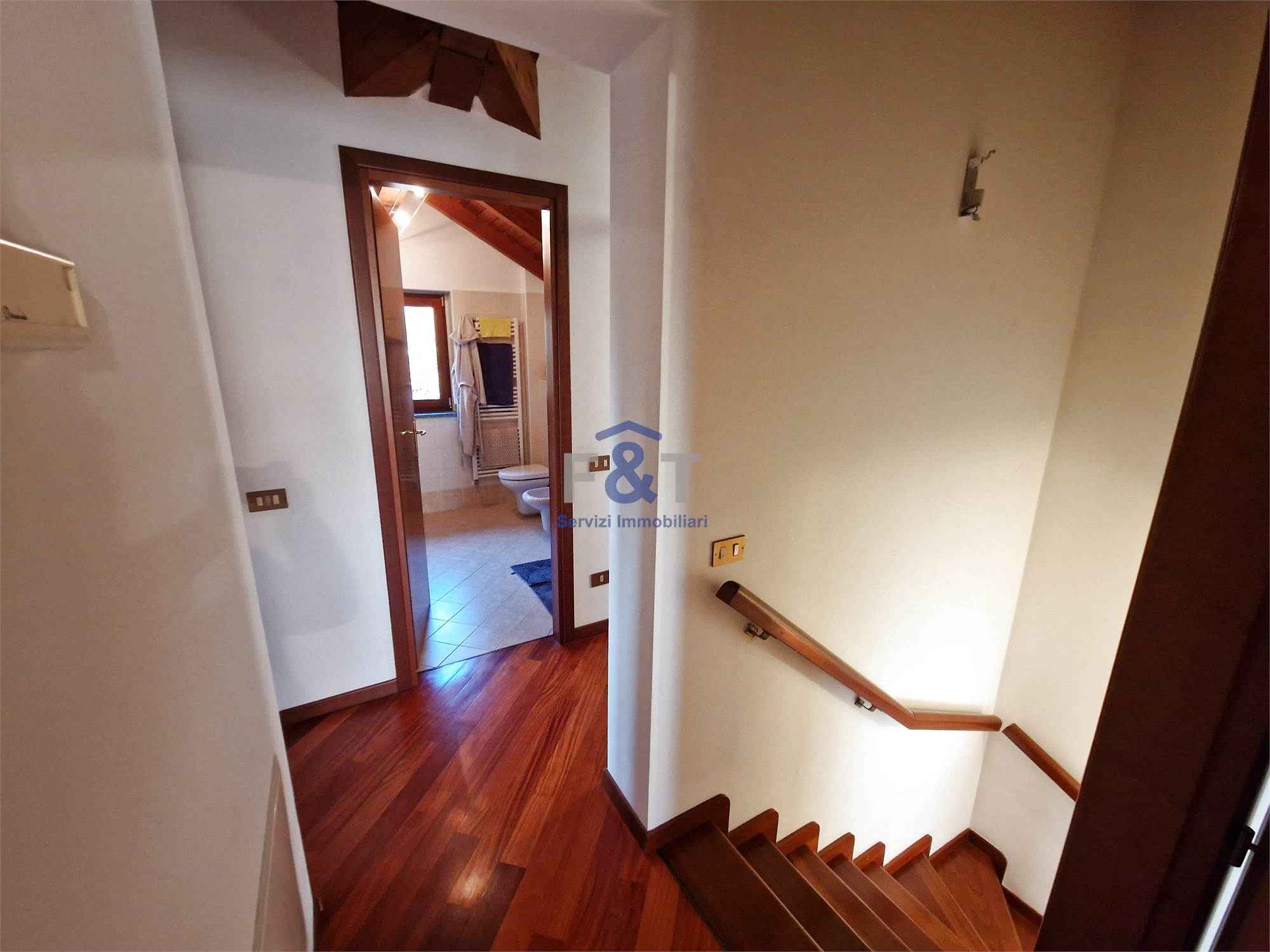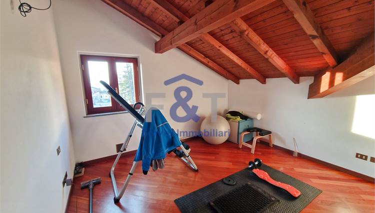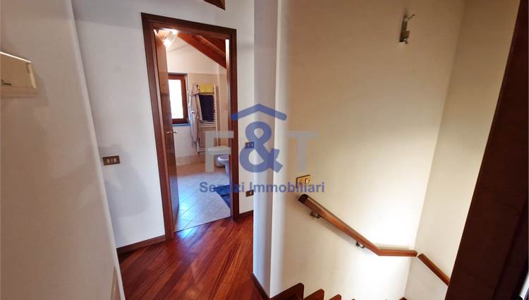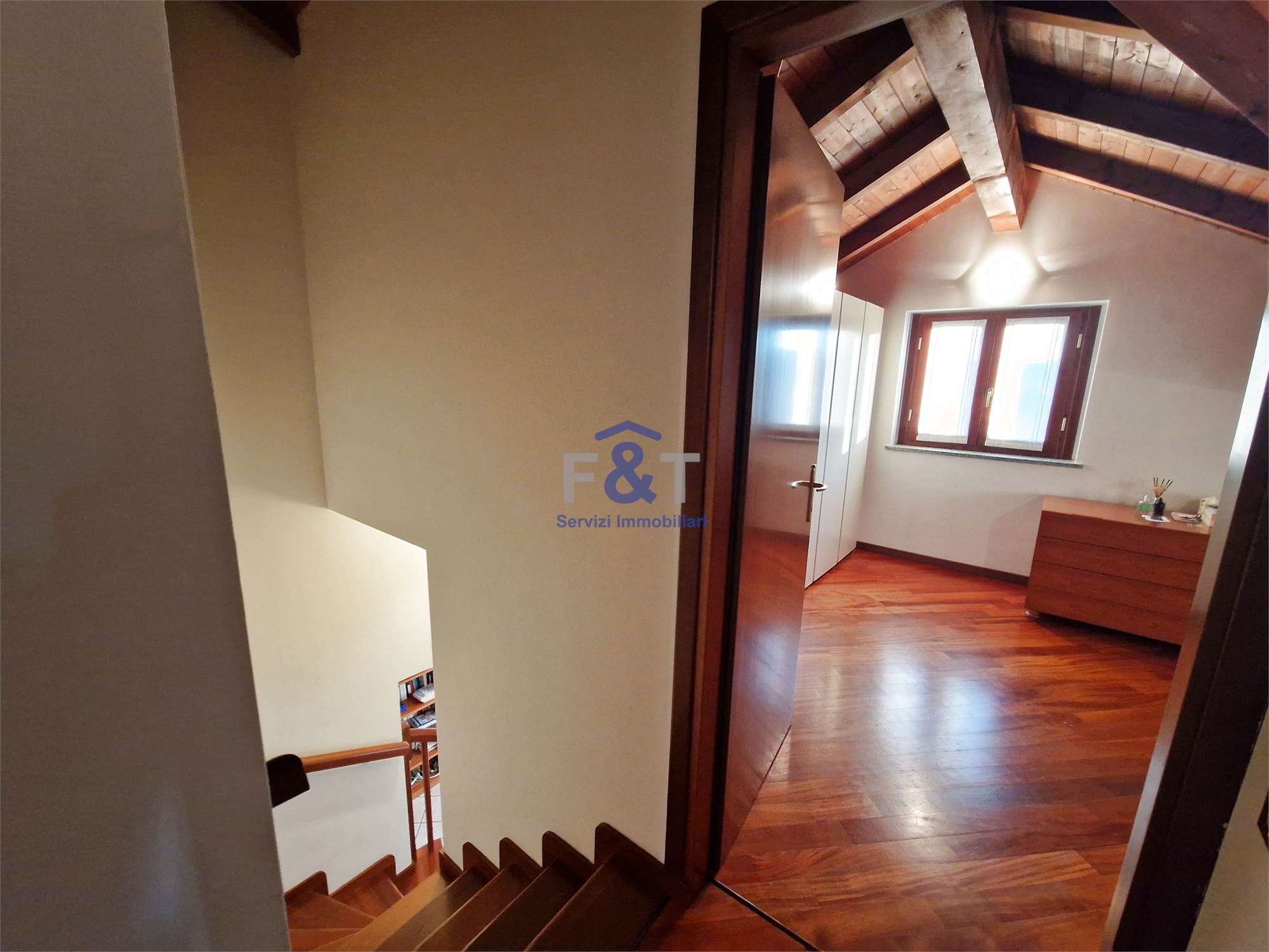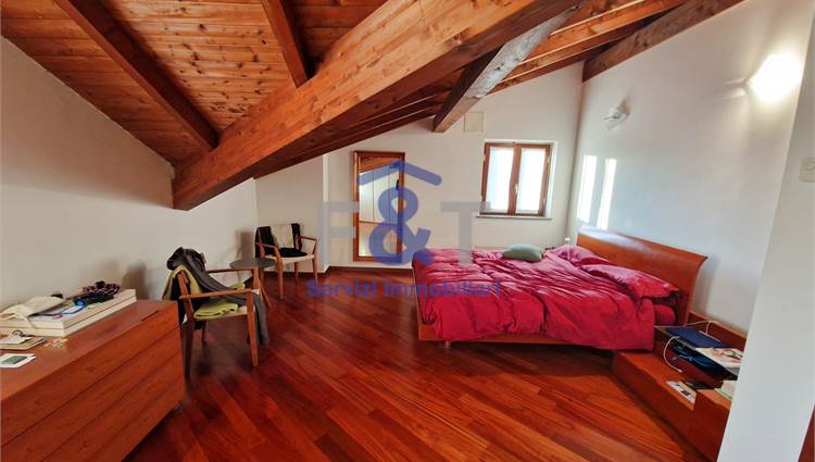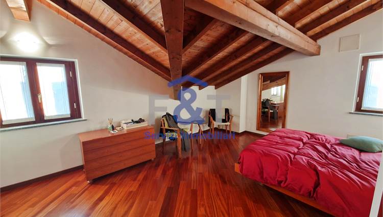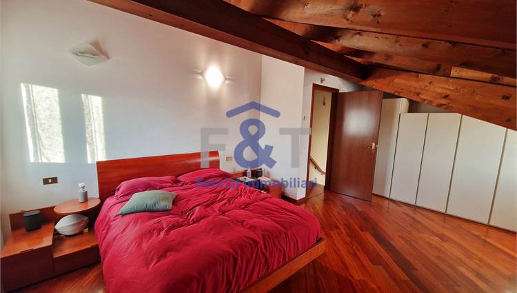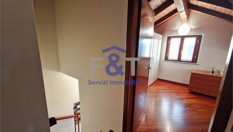 Salendo al secondo piano si accede alla zona notte, impreziosita da pavimenti in legno e travi a vista, dove trovano spazio tre camere da letto di generose dimensioni, un bagno completo con sanitari sospesi e vasca idromassaggio e un comodo ripostiglio utilizzabile anche come cabina armadio.