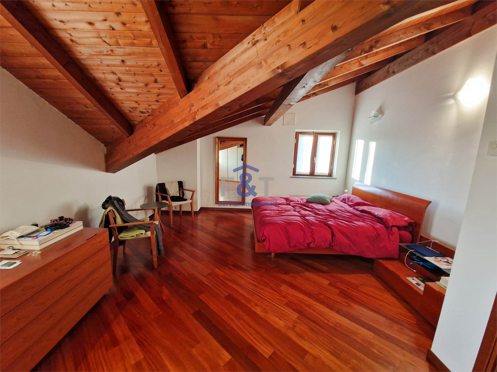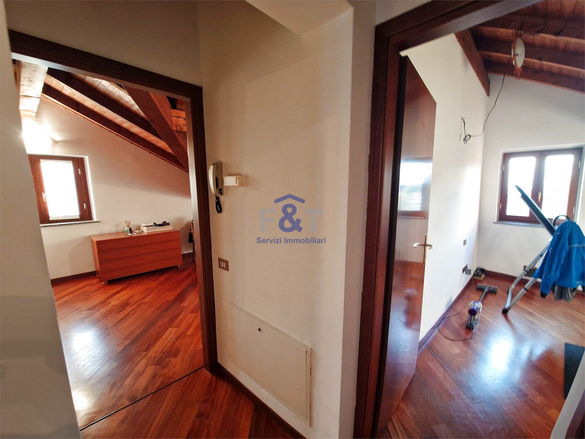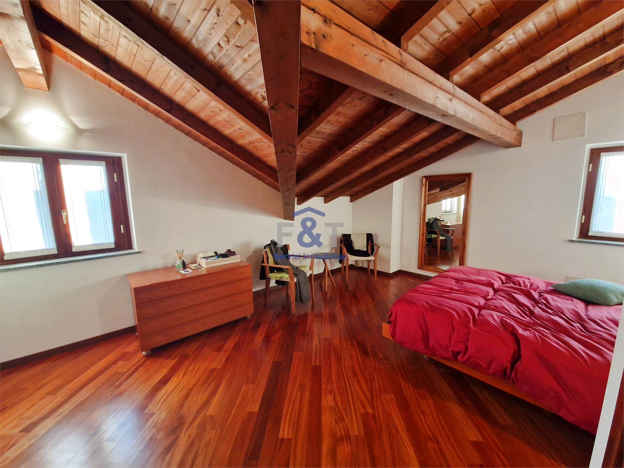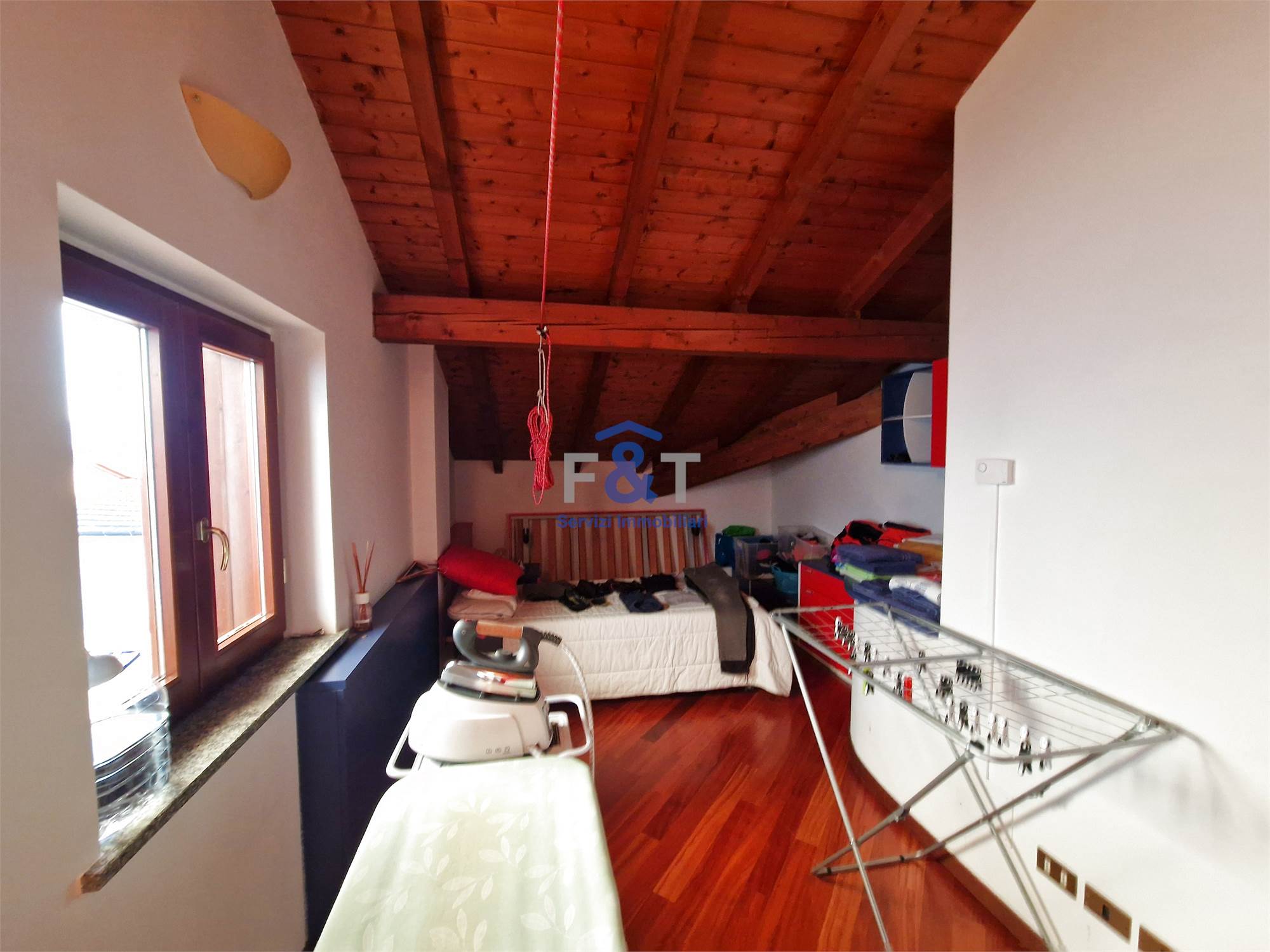 Salendo al secondo piano si accede alla zona notte, impreziosita da pavimenti in legno e travi a vista, dove trovano spazio tre camere da letto di generose dimensioni, un bagno completo con sanitari sospesi e vasca idromassaggio e un comodo ripostiglio utilizzabile anche come cabina armadio.