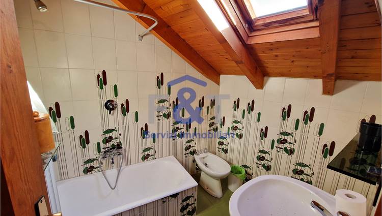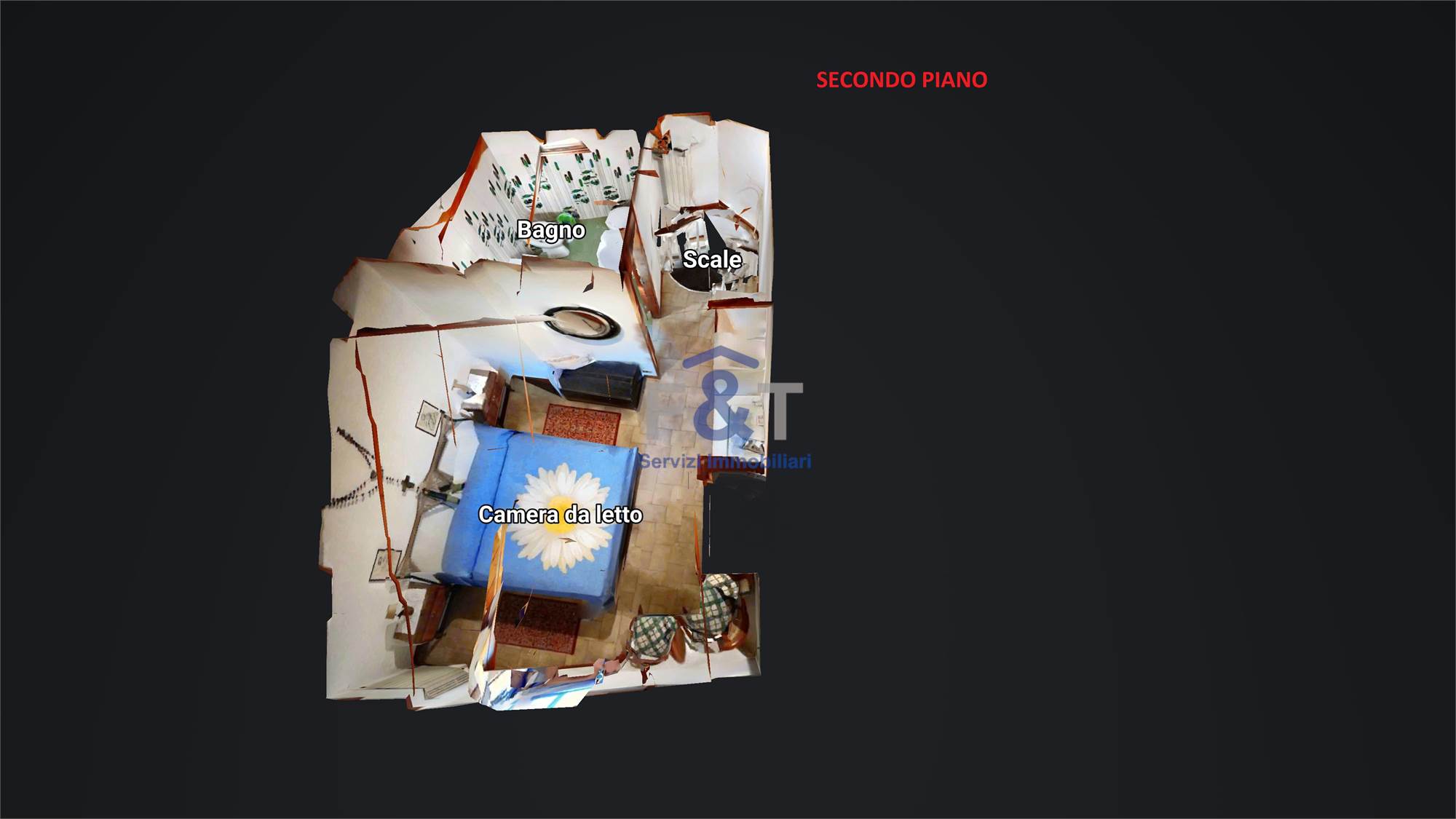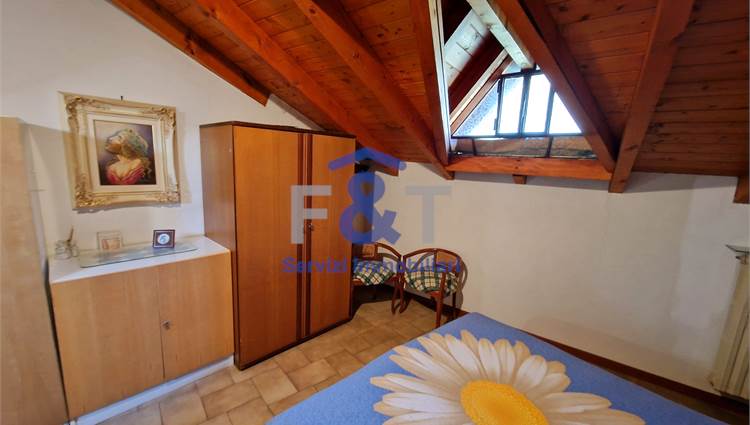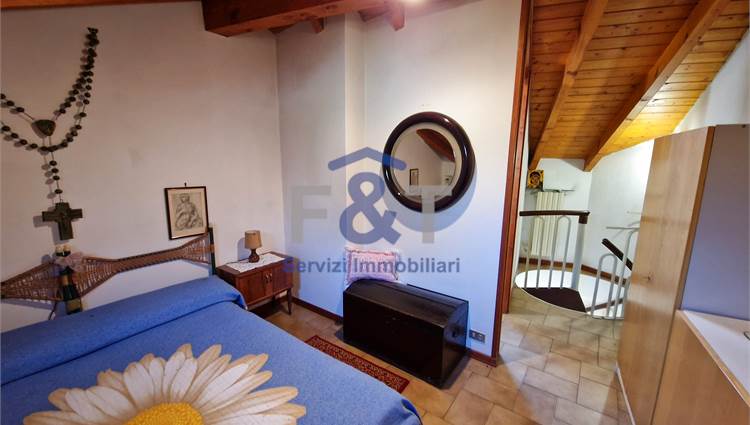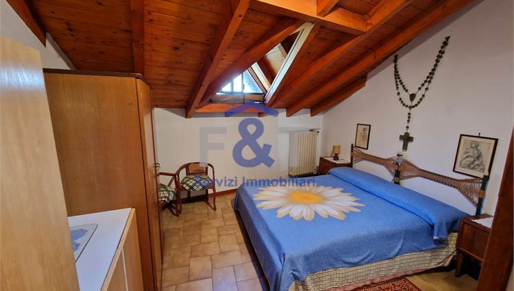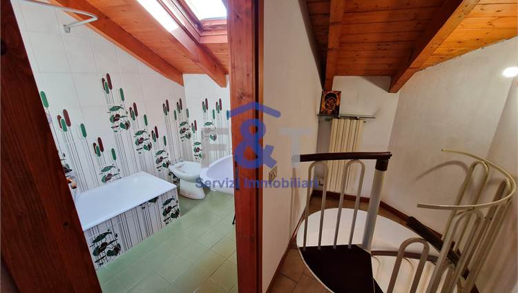 Salendo una caratteristica scala a chiocciola, si giunge al secondo piano, dove una suggestiva camera da letto con travi a vista e finestre Velux regala una sensazione di calore e serenità, accompagnata da un secondo bagno completo con vasca.